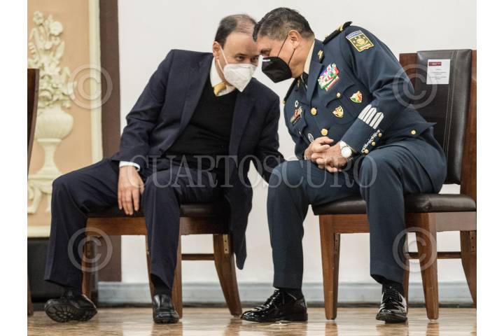CIUDAD DE MÉXICO. 01OCTUBRE2020.- Ceremonia de protesta del General de División Diplomado Estado Mayor retirado, Gilberto Hernández Andreu, como director del Instituto Mexicano de Estudios Estratégicos en Seguridad y Defensa Nacional. Participaron Luis Cresencio Saldoval, de la Sedena, Alfonso Durazo de la SSC Federal y el titular de Marina Rafael Ojeda. Se realalizo en el Colegio Militar de la Colonia Popotla de la alcaldía de Miguel Hidalgo. FOTO; VICTORIA VALTIERRA/CUARTOSCURO.COM