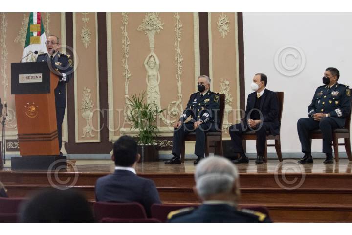 CIUDAD DE MÉXICO. 01OCTUBRE2020.- Ceremonia de protesta del General de División Diplomado Estado Mayor retirado, Gilberto Hernández Andreu, como director del Instituto Mexicano de Estudios Estratégicos en Seguridad y Defensa Nacional. Participaron Luis Cresencio Saldoval, de la Sedena, Alfonso Durazo de la SSC Federal y el titular de Marina Rafael Ojeda. Se realalizo en el Colegio Militar de la Colonia Popotla de la alcaldía de Miguel Hidalgo. FOTO; VICTORIA VALTIERRA/CUARTOSCURO.COM