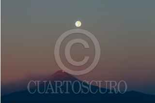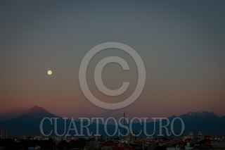 PUEBLA, PUEBLA, 02OCTUBRE2020.- Vista de la primera luna llena de octubre y el volcán popocatépetl al amanecer. FOTO: MIREYA NOVO/ CUARTOSCURO.COM