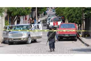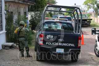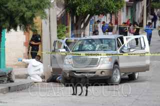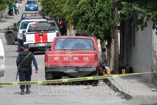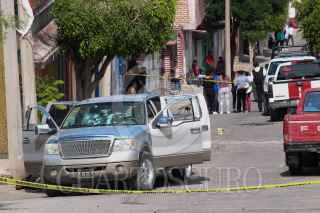 JARAL DEL PROGRESO, GUANAJUATO, 05OCTUBRE2020.- En un velorio que se llevaba a cabo en la calle Felipe Ángeles, en Jaral del Progreso, Guanajuato, cinco personas fueron ultimadas a balazos. Sobre la banqueta quedaron 4 de las víctimas y uno más, a un lado de una camioneta Ford, Pick Up, que quedó con varios impactos en el parabrisas. Las víctimas quienes formaban parte de una banda musical se encontraban al mediodía afuera de la vivienda donde velaban a una persona. Un comando de 12 hombres, en tres camionetas llegaron a dicha calle y con armas de grueso calibre dispararon a los asistentes. Al lugar llegó el Ejército Mexicano, la Guardia Nacional, Policía Municipal y Agentes en Investigación Criminal. FOTO: DIEGO COSTA/CUARTOSCURO.COM