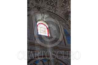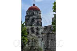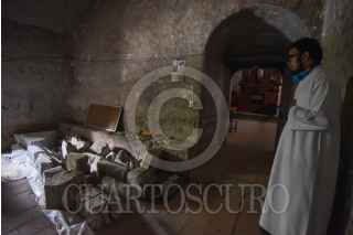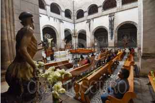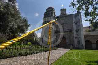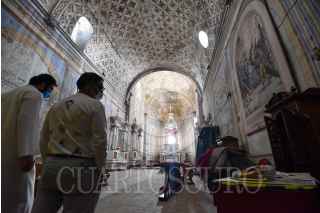 MALINALCO, ESTADO DE MÉXICO, 06OCTUBRE2020.- Uno de los atractivos turísticos del Pueblo Mágico de Malinalco es el Ex Convento Agustino y la Parroquia del Divino Salvador, edificios que sufrieron graves daños a raíz del sismo del 2017, como parte de la restauración de ambos inmuebles se apuntalaron algunas partes del templo que presenta falla estructural y una fractura en la bóveda a la mitad, siendo el edificio más dañado y más retrasado en su restauración; el claustro y el convento tienen un avance en su restauración de un 80 por ciento y algunas partes ya están habilitadas al público, sobre todo para poder oficiar misas que se llevaban a cabo en una huerta al costado del convento; en la entrada de la iglesia fue colocada una malla para evitar la entrada de turistas sobre todo por protección, y en la parte alta instalaron lonas para proteger partes dañadas pero las lluvias y el viento las ha movido lo que ha provocado algunas filtraciones y el reblandecimiento de algunas zonas, para la restauración de la iglesia se necesitan 25 millones de pesos. FOTO: CRISANTA ESPINOSA AGUILAR /CUARTOSCURO.COM