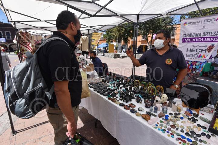 SAN MATEO ATENCO, ESTADO DE MÉXICO, 07OCTUBRE2020.- Artesanos de diversos municipios del Estado de Mexico participan en la Caravana Artesanal Mexiquense que se encuentra recorriendo algunos municipios acercando el colorido arte de distintas regiones como parte de la reactivación económica después de haberse suspendido todas las actividades por la contingencia por COVID-19, ropa de lana, juguetes de madera, muñecas de trapo, cartonería, mezcal, zapatos y prueba de insectos son algunas de las cosas que se pueden encontrar. FOTO: CRISANTA ESPINOSA AGUILAR /CUARTOSCURO.COM