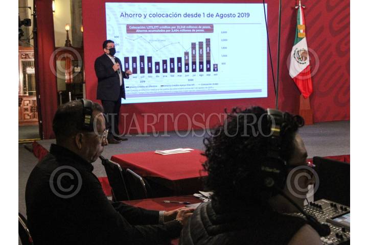 CIUDAD DE MÉXICO, 07OCTUBRE2020.- Graciela Márquez, titular de la Secretaría de Economía y Alberto Ortiz, director general del Fonscot, durante la conferencia de en Palacio Nacional, en donde dieron a conocer que más de 1 millón de trabajadores ya cuentan con diversos créditos otorgados por el Instituto del Fondo Nacional para el Consumo de los Trabajadores. Así mismo Alberto Ortiz informó que se está trabajando en una aplicación para facilitar y tener un mayor control en créditos. FOTO: ROGELIO MORALES /CUARTOSCURO.COM