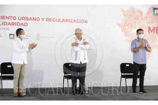 PLAYA DEL CARMEN, QUINTANA ROO, 11OCTUBRE2020.- Andrés Manuel López Obrador, Presidente de México, presidió el evento "Acciones de mejoramiento urbano y regularización en el municipio de Solidaridad en Ciudad Juventud". El mandatario fue acompañado por: Carlos Manuel Joaquín González, gobernador de Quintana Roo; Rogelio Jiménez Pons Director de FONATUR; Román Meyer Falcón, secretario de Desarrollo Agrario, Territorial y Urbano y la presidenta municipal de Solidaridad, Laura Beristain Navarrete. FOTO: PRESIDENCIA/CUARTOSCURO.COM