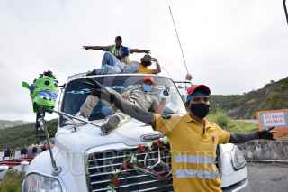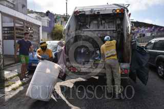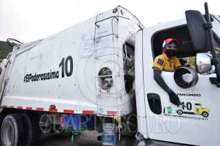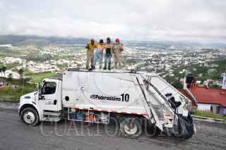 CHILPANCINGO, GUERRERO, 11OCTUBRE2020.- Trabajadores de Servicios Públicos de Chilpancingo, de nueva cuenta se vuelven tendencia en redes sociales, tanto así que la empresa de lucha libre Triple AAA Worldwide los buscó para invitarlos a una función de ‘Autoluchas’, modalidad que ha empleado la empresa durante esta contingencia sanitaria. Esto derivado de que los operadores del camión recolector de basura marcado con el número 10, también conocido como ‘El Poderosísimo 10’ realizaron un video en TikTok donde simulaban ser los luchadores ‘Mascara Sagrada’ y ‘Aerostar’, con la famosa canción del Conjunto África - Los Luchadores, en una contienda que termino con un conteo de 3 segundos, luego de un mortal hacia atrás sobre uno de sus compañeros que quedo postrado en un costal lleno de botellas de plástico reciclado. Además de que este video, en menos de 48 horas llego a juntar más de un millón de reproducciones, más de 112 mil ‘me gusta’ y cerca de 4 mil comentarios, tan solo en TikTok. En entrevista, previa a su jornada laboral, los jóvenes Michel Sánchez "Maicool" de 22 años; Ángel Salazar "Chon" de 25 años; Rigoberto González "Frijol" 21 años y Juan Sánchez "Zorry" de 30 años, dijeron tener los pies sobre la tierra y disfrutaran su momento de fama el tiempo que tenga que durar. FOTO: DASSAEV TÉLLEZ ADAME/CUARTOCURO.COM
