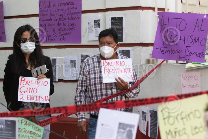 CIUDAD DE MÉXICO, 12OCTUBRE2020.- Un grupo de mujeres se manifestaron afuera de la sede de Morena para acusar a Porfirio Muñoz Ledo de supuestamente haber acosado a mujeres menores de edad, el morenistas había anunciado que iba acudir a la sede del Morena para tomar protesta como dirigente del partido, esto en medio de la controversia de no haber un resultado claro entre los dos competidores: Porfirio Muñoz Ledo y Mario Delgado. FOTO: MOISÉS PABLO/CUARTOSCURO.COM