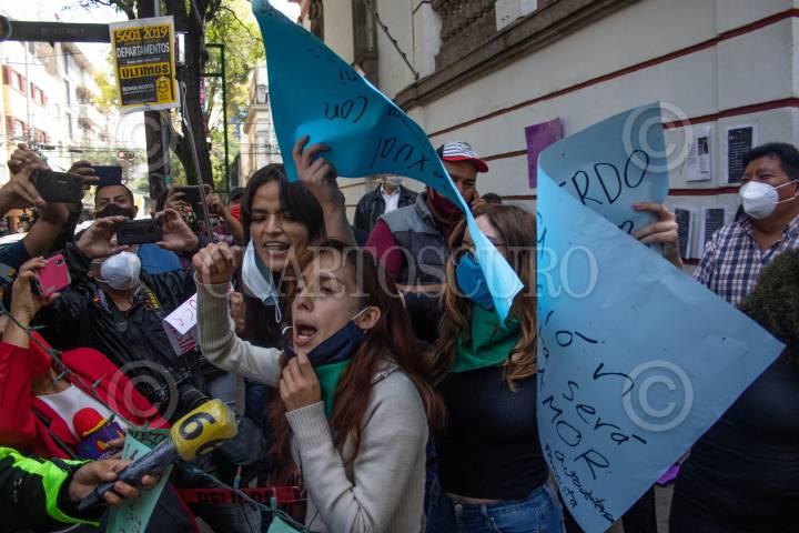 CIUDAD DE MÉXICO, 12OCTUBRE2020.- Un grupo de mujeres se manifestaron afuera de la sede de Morena para acusar a Porfirio Muñoz Ledo de supuestamente haber acosado a mujeres menores de edad, el morenistas había anunciado que iba acudir a la sede del Morena para tomar protesta como dirigente del partido, esto en medio de la controversia de no haber un resultado claro entre los dos competidores: Porfirio Muñoz Ledo y Mario Delgado. FOTO: MOISÉS PABLO/CUARTOSCURO.COM