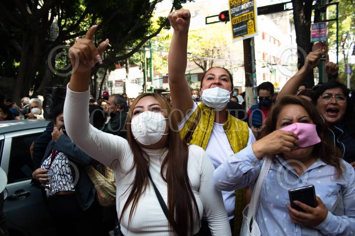 CIUDAD DE MÉXICO, 12OCTUBRE2020.- Un grupo de mujeres se manifestaron afuera de la sede de Morena para acusar a Porfirio Muñoz Ledo de supuestamente haber acosado a mujeres menores de edad, el morenistas había anunciado que iba acudir a la sede del Morena para tomar protesta como dirigente del partido, esto en medio de la controversia de no haber un resultado claro entre los dos competidores: Porfirio Muñoz Ledo y Mario Delgado. FOTO: MOISÉS PABLO/CUARTOSCURO.COM