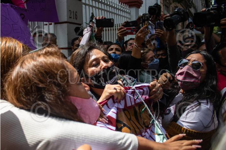 CIUDAD DE MÉXICO, 12OCTUBRE2020.- Un grupo de mujeres se manifestaron afuera de la sede de Morena para acusar a Porfirio Muñoz Ledo de supuestamente haber acosado a mujeres menores de edad, el morenistas había anunciado que iba acudir a la sede del Morena para tomar protesta como dirigente del partido, esto en medio de la controversia de no haber un resultado claro entre los dos competidores: Porfirio Muñoz Ledo y Mario Delgado. FOTO: MOISÉS PABLO/CUARTOSCURO.COM