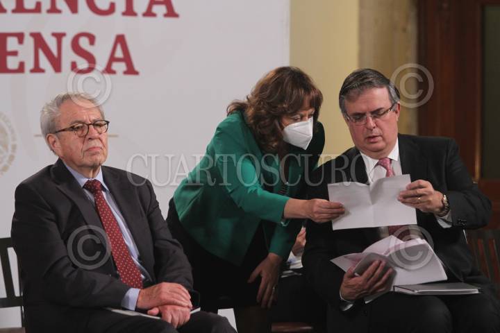 CIUDAD DE MÉXICO, 10OCTUBRE2020. - Andrés Manuel López Obrador, presidente de México acompañado de Jorge Alcocer Varela, secretario de Salud; Marcelo Ebrard, secretario de Relaciones Exteriores; Arturo Herrera Gutierrez, secretario de Hacienda y Crédito Público; Hugo López Gatell Ramírez, subsecretario de Protección y Promoción de la Salud; Martha Delgado, subsecretaria para Asuntos Multilaterales y Derechos Humanos; Sylvia Varela, presidenta y directora general de AstraZeneca México; Lizete de la Torre, directora de Asuntos Corporativos y Health & Value de Pfizer México y Yu Xuefeng, director ejecutivo de CanSino Biologics (conectado vía remota) durante la conferencia matutina en Palacio Nacional. FOTO: ANDREA MURCIA /CUARTOSCURO. COM