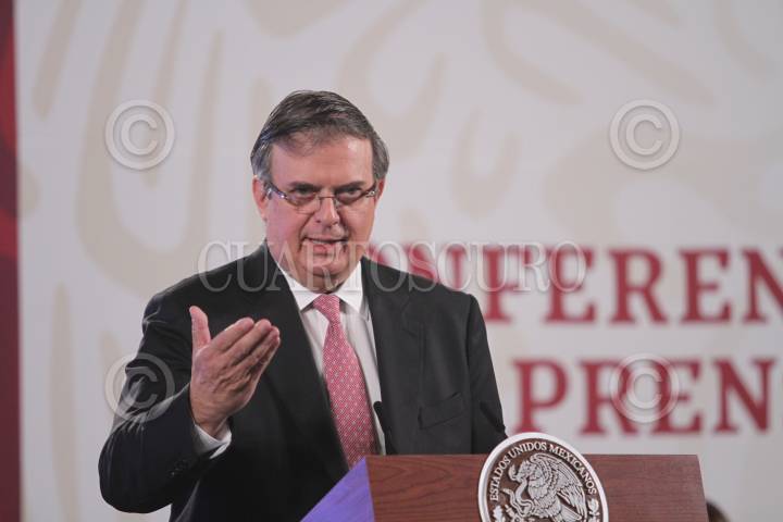 CIUDAD DE MÉXICO, 10OCTUBRE2020. - Andrés Manuel López Obrador, presidente de México acompañado de Jorge Alcocer Varela, secretario de Salud; Marcelo Ebrard, secretario de Relaciones Exteriores; Arturo Herrera Gutierrez, secretario de Hacienda y Crédito Público; Hugo López Gatell Ramírez, subsecretario de Protección y Promoción de la Salud; Martha Delgado, subsecretaria para Asuntos Multilaterales y Derechos Humanos; Sylvia Varela, presidenta y directora general de AstraZeneca México; Lizete de la Torre, directora de Asuntos Corporativos y Health & Value de Pfizer México y Yu Xuefeng, director ejecutivo de CanSino Biologics (conectado vía remota) durante la conferencia matutina en Palacio Nacional. FOTO: ANDREA MURCIA /CUARTOSCURO. COM