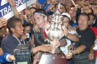 QUERÉTARO, QUERÉTARO 28MAYO2006.- Los gallos Blancos de Querétaro vencieron tres goles a cero a los Camoteros de Puebla en el partido final de la división A disputado en el Estadio Corregidora con lo que ascendería a la primera división del balonpié nacional. FOTO: Iván Stephens/CUARTOSCURO.COM