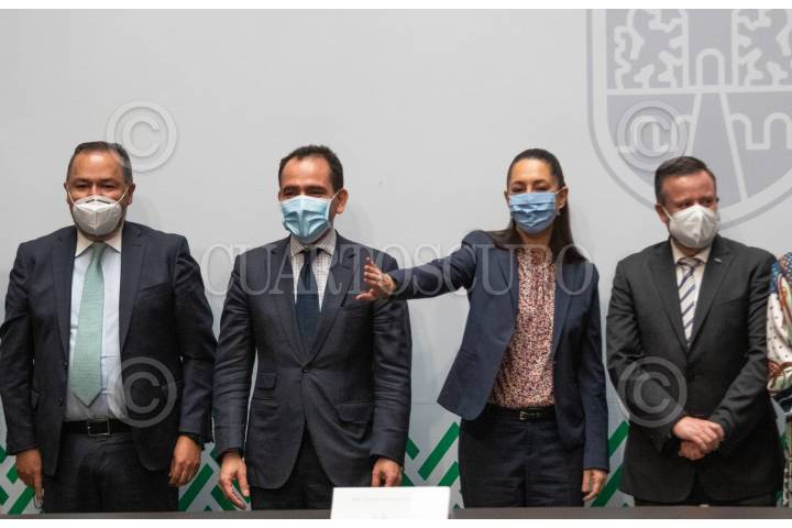 CIUDAD DE MÉXICO, 14OCTUBRE2020.- Claudia Sheinbaum Pardo, Jefa de Gobierno; Arturo Herrera, secretario de Hacienda y Crédito Público; Luz Elena González Escobar, secretaria de Administración y Finanzas, y Eduardo Ramírez Leal, presidente de la Cámara Mexicana de la Industria de la Construcción (CMIC), durante la presentación del programa "Reactivación Económica para el Bienestar de la Ciudad de México. Convenio con la Sociedad Hipotecaria Federal", en el Antiguo Palacio del Ayuntamiento. FOTO: MOISÉS PABLO/CUARTOSCURO.COM