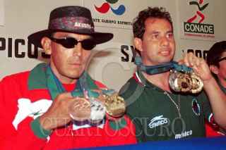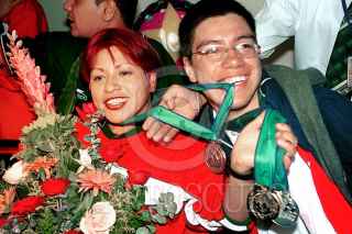 Moises Beristain y Salvador Hernandez muestran con orgullo sus preseas obtenidas en los Juegos Paralimpicos de Australia, a su llegada a México. FOTO: Eduardo Loza/CUARTOSCURO.COM