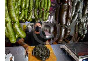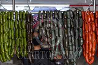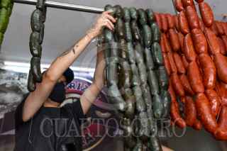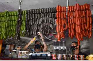 TOLUCA, ESTADO DE MÉXICO, 14OCTUBRE2020.- La capital mexiquense es conocida por el tradicional chorizó rojo o verde, pero a esta variedad se le han unido otros sabores como el Chorizombie creado por tres emprendedores dedicados a la charcutería y dueños de Chorizos DM Toluca, quienes tienen chorizos de temporada, y desde hace tres años tienen este chorizó durante la celebración de Día de Muertos, el cual es una receta secreta a base de chiles secos, logrando un aspecto negro que intriga a los compradores, aparte de este chorizó especial tiene uno Navideño a base de Jamaica y betabel, otro el Día del padre que es elaborado con salsa BBQ y whisky, en agosto preparan butifarra adaptando una receta catalana, aparte de otros sabores como chile habanero, vino blanco, chile morita, y los tradicionales, ubicados a unos metros del Estadio Nemesio Diez ofrecen esta gran variedad de chorizos. FOTO: CRISANTA ESPINOSA AGUILAR /CUARTOSCURO.COM