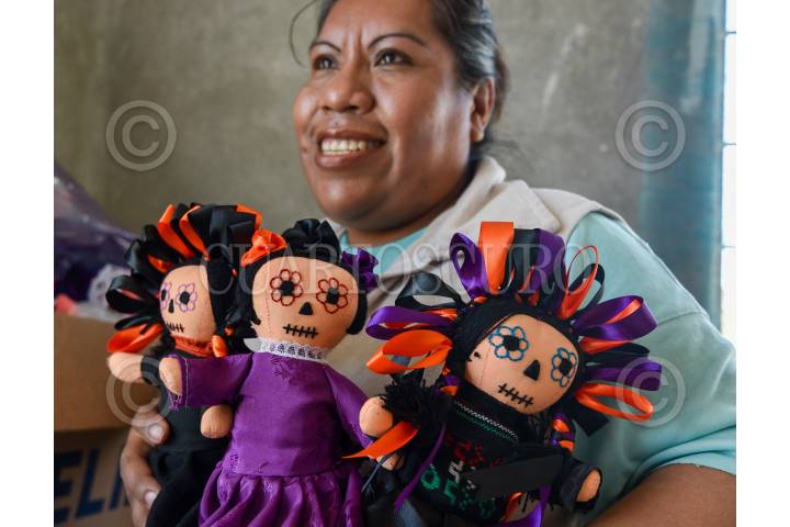 TOLUCA, ESTADO DE MÉXICO, 15OCTUBRE2020.- Margarita Macías originaria de Santiago Mexquititlán en Querétaro y radicada desde hace algunos años en Toluca se dedica a elaborar la tradicional muñeca Ar lë-lë xnutsi, muñecas de trapo Otomí, su mamá le enseñó a elaborarlas y ahora se dedica a darle vida a la tela y listones convirtiéndolas en muñecas de trapo, su cara es bordada a mano, ojos, boca y nariz; para la celebración del Día de muertos confeccionó una muñeca de catrina, con vestidos y listones negros en su mayoría y en algunos otros modelos llega a ponerle algún otro color, mezclando estas dos tradiciones busca que no se pierdan, sus muñecas las vende en ferias artesanales y pide que se aprecie el trabajo que cada artesano realiza. FOTO: CRISANTA ESPINOSA AGUILAR /CUARTOSCURO.COM