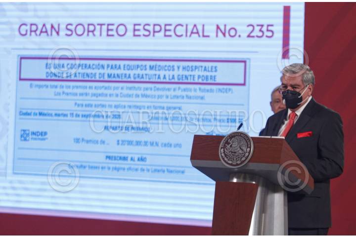 CIUDAD DE MÉXICO, 16OCTUBRE2020.- Andrés Manuel López Obrador, presidente de México acompañado de Margarita González Saravia, directora general de la Lotería Nacional para la Asistencia Pública; Ernesto Prieto Ortega, director general del Instituto para Devolver al Pueblo lo Robado (Indep); Alejandro Esquer Verdugo, secretario particular del presidente; Ana Aurora Alarcón, presidenta de la Fundación Delia Moran Vidanta; Emiliano Calderón Mercado, coordinador durante la conferencia matutina donde se presentó el boleto en apoyo a las Escuelas del país. FOTO: ANDREA MURCIA /CUARTOSCURO.COM
