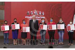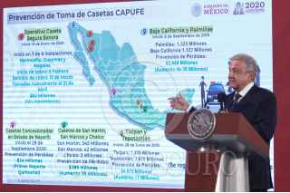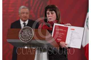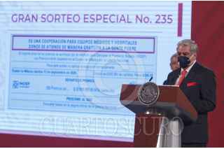 CIUDAD DE MÉXICO, 16OCTUBRE2020.- Andrés Manuel López Obrador, presidente de México acompañado de Margarita González Saravia, directora general de la Lotería Nacional para la Asistencia Pública; Ernesto Prieto Ortega, director general del Instituto para Devolver al Pueblo lo Robado (Indep); Alejandro Esquer Verdugo, secretario particular del presidente; Ana Aurora Alarcón, presidenta de la Fundación Delia Moran Vidanta; Emiliano Calderón Mercado, coordinador durante la conferencia matutina donde se presentó el boleto en apoyo a las Escuelas del país. FOTO: ANDREA MURCIA /CUARTOSCURO.COM
