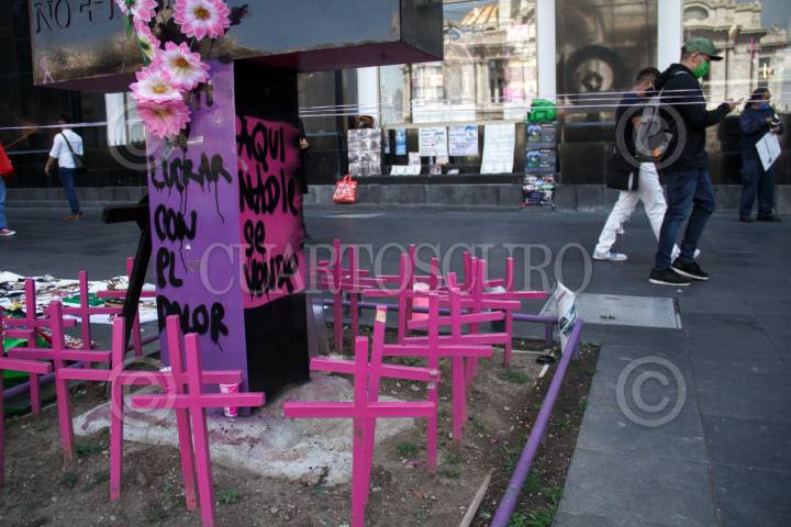 CIUDAD DE MÉXICO, 17OCTUBRE2020.- El pasado jueves por la madrugada integrantes del bloque Negro pintaron de negro y dejaron mensajes. La antimonumenta fue colocada en 2019 frente al Palacio de Bellas Artes por madres de víctimas de feminicidio. Por ahora colectivas feministas resguardan la zona para poderle dar mantenimiento. FOTO: ANDREA MURCIA /CUARTOSCURO.COM