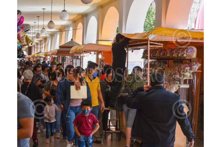 TOLUCA, ESTADO DE MÉXICO, 19OCTUBRE2020.- Ante la contingencia por COVID-19 y el semáforo en Naranja en el Estado de México, la tradicional Feria del Alfeñique se vio reducida en tiempo y número de puestos de venta de dulces, en esta ocasión solo se dejaron instalar 54 alacenas, las cuales deberán tener protección con micas entre los visitantes y los dulces, los dulces deberán estar empaquetados de forma individual, se debe usar cubrebocas y careta; los artesanos en su mayoría redujeron su producción más del 50 por ciento ante la incertidumbre de la realización de la feria, solo estarán del 19 de octubre hasta el 2 de noviembre y se recomienda a los visitantes seguir las medidas higiénicas durante su recorrido para evitar contagios por coronavirus. FOTO: CRISANTA ESPINOSA AGUILAR /CUARTOSCURO.COM