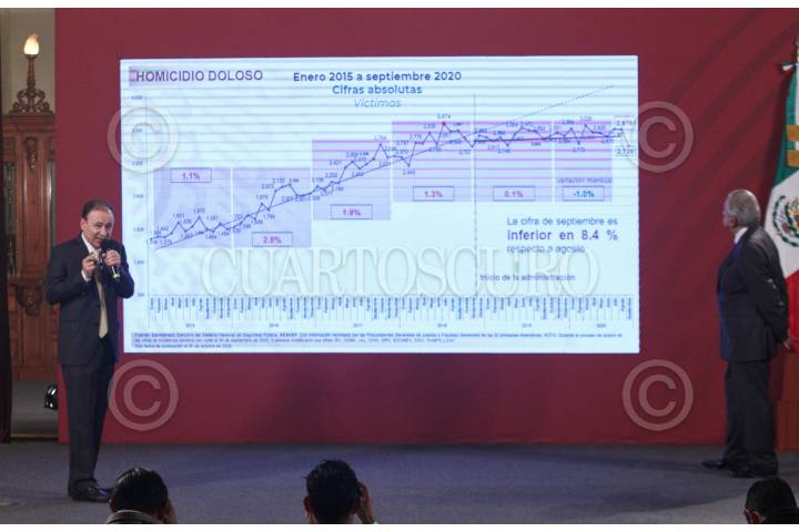 CIUDAD DE MÉXICO, 21OCTUBRE2020.- Andrés Manuel López Obrador, presidente de México, acompañado de Alfonso Durazo, secretario de Seguridad; Luis Cresencio Sandoval González, secretario de la Defensa Nacional; Julio Scherer Ibarra, consejero jurídico de Presidencia; Luis Rodríguez Bucio, titular de la Guardia Nacional; Jorge Nuño Lara, Jefe de la Unidad de Inversiones de la secretaría de Hacienda; Almirante Luis Orozco Inclán, jefe de estado mayor general de la Armada; María Elena Álvarez Buylla, directora general del Consejo Nacional de Ciencia y Tecnológica (CONACYT); Rodolfo Gonzalez Valderrama, director general de Radio, Televisión y Cinematografia (RTC) y José Antonio Álvarez Lima, director de Canal Once, durante la conferencia matutina enfocada al tema de seguridad. Se lleva a cabo en Palacio Nacional. FOTO: ANDREA MURCIA /CUARTOSCURO.COM