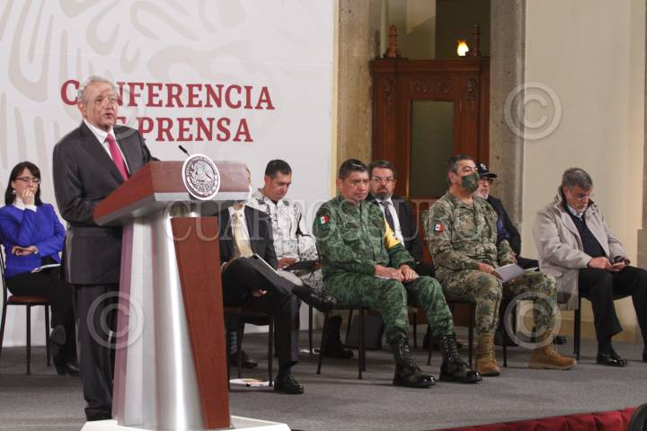 CIUDAD DE MÉXICO, 21OCTUBRE2020.- Andrés Manuel López Obrador, presidente de México, acompañado de Alfonso Durazo, secretario de Seguridad; Luis Cresencio Sandoval González, secretario de la Defensa Nacional; Julio Scherer Ibarra, consejero jurídico de Presidencia; Luis Rodríguez Bucio, titular de la Guardia Nacional; Jorge Nuño Lara, Jefe de la Unidad de Inversiones de la secretaría de Hacienda; Almirante Luis Orozco Inclán, jefe de estado mayor general de la Armada; María Elena Álvarez Buylla, directora general del Consejo Nacional de Ciencia y Tecnológica (CONACYT); Rodolfo Gonzalez Valderrama, director general de Radio, Televisión y Cinematografia (RTC) y José Antonio Álvarez Lima, director de Canal Once, durante la conferencia matutina enfocada al tema de seguridad. Se lleva a cabo en Palacio Nacional. FOTO: ANDREA MURCIA /CUARTOSCURO.COM