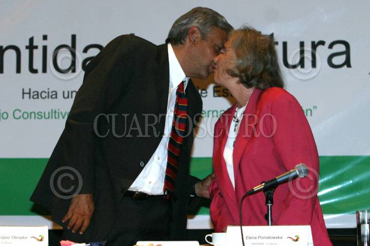 MEXICO, D.F. 30MAYO2006.- Andrés Manuel López Obrador candidato de la coalición por el Bien de Todos y Elena Poniatowska al termino del foro Identidad y Cultura. FOTO: Nelly Salas/CUARTOSCURO.COM