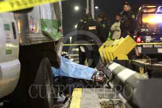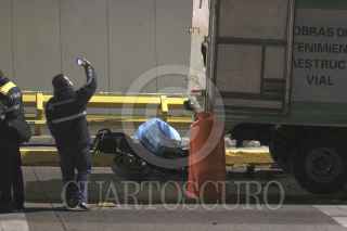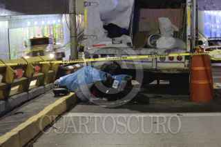 Ciudad de México, 22 octubre 2020. Un hombre murió esta madrugada y una mujer resultó lesionada en un accidente de motocicleta, sobre los carriles centrales del Circuito Interior en el paso a desnivel de Marina Nacional. La motocicleta se estrelló en la parte trasera de un camión que estaba estacionado en los carriles de alta velocidad abanderando a una cuadrilla de trabajadores del mantenimiento a la estructura vial. Foto: Luis Carbayo/cuartoscuro.com