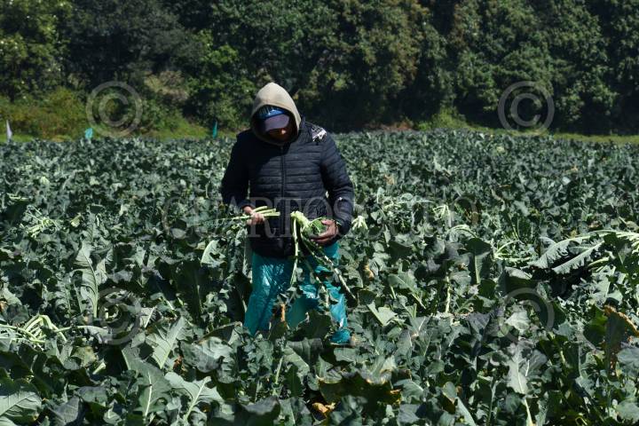 TENANGO DEL VALLE, ESTADO DE MÉXICO, 22OCTUBRE2020.- Algunos productores de San Francisco Putla en Tenango del Valle han optado por cambiar la siembra de las flores por verduras, ante la incertidumbre de si podrán comercializar las flores como cada año lo hacen para el Día de Muertos, por la pandemia por COVID-19, la mayoría de campos se pueden ver con cosechas de col, brócoli, cilantro, lechugas y algunos otros vegetales, que son más fáciles de vender, de acuerdo a los productores, quienes desde muy temprana hora acuden a los campos a cosechar las verduras y poder llevarlas para su venta. FOTO: CRISANTA ESPINOSA AGUILAR /CUARTOSCURO.COM