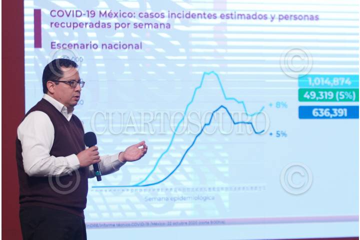 CIUDAD DE MÉXICO, 22OCTUBRE2020. - Hugo López-Gatell, titular de la Subsecretaría de Prevención y Promoción de la Salud y José Luis Alomía Zegarra, director general de epidemiología de la Secretaría de Salud, durante la conferencia de informe COVID-19 que se lleva a cabo en Palacio Nacional. FOTO: ANDREA MURCIA /CUARTOSCURO.COM