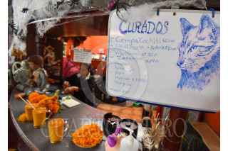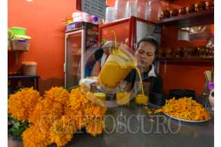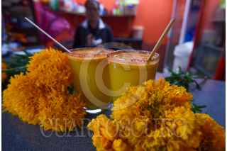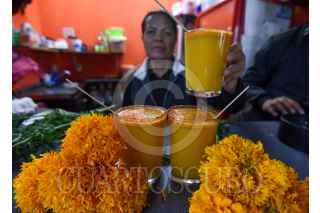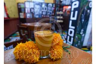 METEPEC, ESTADO DE MÉXICO, 23OCTUBRE2020.- La Pulqueria La Revolución de Mayahuel ofrecen durante esta temporada un curado preparado a base de los pétalos de la flor de cempasúchil, utilizada durante la celebración de Día de Muertos para adornar altares y tumbas; la mezcla del pulque, una bebida tradicional que se reíste a desaparecer y el cempasúchil es una forma de honrar a los Muertos de acuerdo a Juan Manuel Gutiérrez o Makehua Octli que significa Guardián del Pulque y Enny Guadarrama o Ome Ocelet o 2 jaguar, quienes son dueños de esta Pulqueria en Metepec y buscan preservar estar bebida en el gusto de la población con diversos curados. FOTO: CRISANTA ESPINOSA AGUILAR /