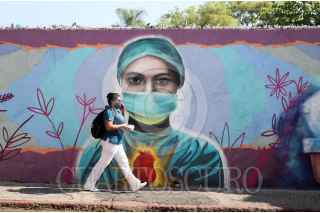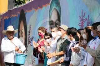 CUERNAVACA, MORELOS,23OCTUBRE2020.- Apoyado por el ayuntamiento de la capital, el artista visual Eduardo reconoce labor de médicos que atienden a pacientes con el virus Sars-Covid-2, con mural de grafiti. En la imagen personas pasan frente al mural ubicada en la calle Arteaga del centro de la ciudad. En la imagen un vendedor pasa frente a funcionarios que inauguran el mural. FOTO: MARGARITO PÉREZ RETANA /CUARTOSCURO.COM