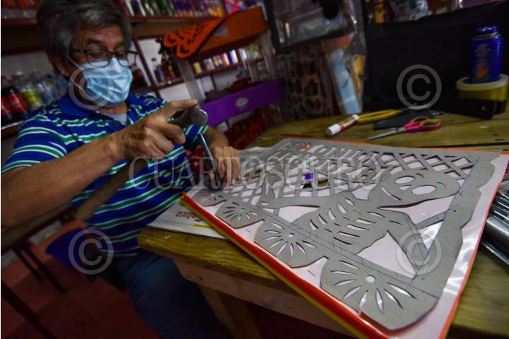 METEPEC, ESTADO DE MÉXICO, 25OCTUBRE2020.- La Familia Morán, conformada por Gabriel Morán, su esposa Eva Alcantara y sus hijas Berenice y Betsabé, desde hace 25 años se dedican a la elaboración de papel picado tradicional, trabajan durante todo el año, pero la época de Día de Muertos es la más laboriosa, aunque en esta ocasión las cosas cambiaron por la Pandemia por COVID-19, sus pedidos bajaron hasta en un 70 por ciento, y tuvieron que buscar alternativas para poder continuar con su negocio ante las bajas ventas, sacando otros artículos de papel como flores y letreros de felicitaciones; el trabajo del papel picado se realiza un diseño en plantillas de papel, se coloca un alma de plástico para que el papel China no se rompa, se colocan los colores de papel China que será picado y con cinceles de diversos tamaños y martillo se va dando vida al papel que adornará las ofrendas el Día de Muertos, el tiempo de elaboración depende del tamaño de cada pieza, que pueden ir de 4 horas en adelante picando a mano. Llegan a manejar 150 modelos de papel picado que van desde 1/16 hasta un pliego; piden que se continúe con las tradiciones, que no se olviden a los artesanos y se compre lo que hacen con el corazón todos los días. FOTO: CRISANTA ESPINOSA AGUILAR /CUARTOSCURO.COM