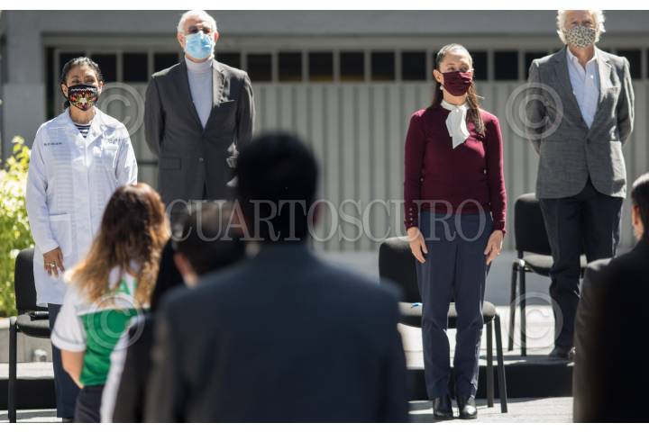 CIUDAD DE MÉXICO. 26OCTUBRE2020.- La jefa del Gobierno de la Ciudad, Claudia Sheinbaum Pardo, acompañada de la titular de Salud, Olivia López Arellano, celebraron en la explanada de la dependencia, el Día del Médico. Entregaron premios y reconocimientos a personal de la salud. FOTO: VICTORIA VALTIERRA/CUARTOSCURO.COM