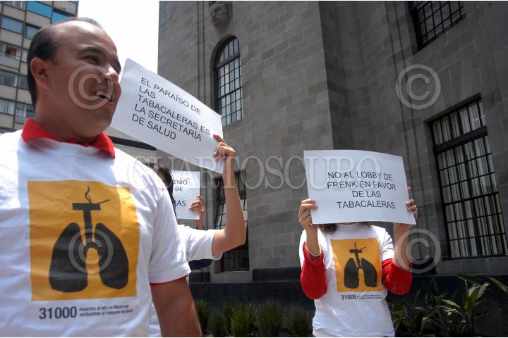 MÉXICO D.F. 31 MAYO 2006.- Jesús Robles, presidente del partido Alternativa Social Demócrata y Campesina y un grupo de jóvenes y militantes de Alternativa se manifestarón a las afueras de las intalaciones de la Secretaria de Salud, por la ineficiencia de la campaña encontra del tabaquismo que realiza esta secretaria, esto en el día Mundial Sin Tabaco. FOTO : Guillermo Perea/ CUARTOSCURO.COM