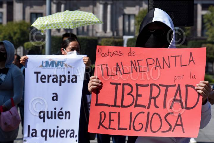 TOLUCA, ESTADO DE MÉXICO, 27OCTUBRE2020.- En el marco del Día de la Libertad Religiosa integrantes de la Unidad Ministerial Del Valle de Toluca (UMIVAT) manifestaron en la Cámara de Diputados local su rechazo a la reforma aprobada por los legisladores en el artículo 211, en donde se estableció es sanciones de hasta tres años de prisión a quien practiqué las terapias de conversión sexual. FOTO: CRISANTA ESPINOSA AGUILAR /CUARTOSCURO.COM