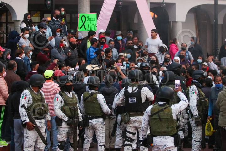 OCOYOACAC, ESTADO DE MÉXICO, 27OCTUBRE2020.- Pobladores de Ocoyoacac se manifestaron en el Palacio Municipal exigiendo seguridad y justicia después del asesinato de una familia en este municipio, rompieron vidrios del edificio y vandalizaron una patrulla, al no ser recibidos por la alcaldesa Anallely Olivares; en repetirás ocasiones la seguridad ha sido un reclamo por parte de la población; el inmueble fue cerrado con cadena y candado y elementos de la Guardia Nacional dialogaron con los pobladores. FOTO: CRISANTA ESPINOSA AGUILAR /CUARTOSCURO.COM