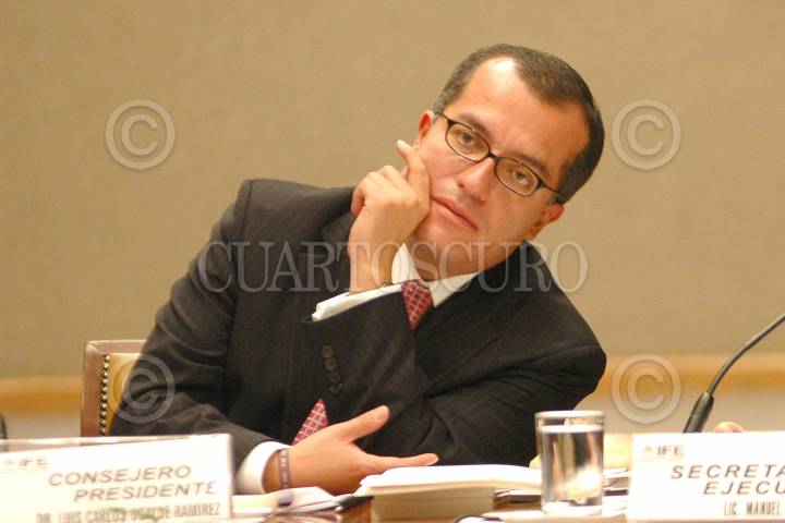 MÉXICO, D.F. 31MAYO2006.- Germán Martínez, representante del Partido Acción Nacional (PAN) ante el Instituto Federal Electoral (IFE) conversa con los consejeros Rodrigo Morales Manzanares y Marco Antonio Gómez Alcántar, durante la sesión ordinaria del IFE donde los consejeros resolvieron sancionar al PAN con 146 mil pesos por violar el artícvulo 25 del código electoral que obliga a los institutos políticos a rechazar apoyo de extranjeros en sus campañas. FOTO: Iván Stephens/CUARTOSCURO.COM