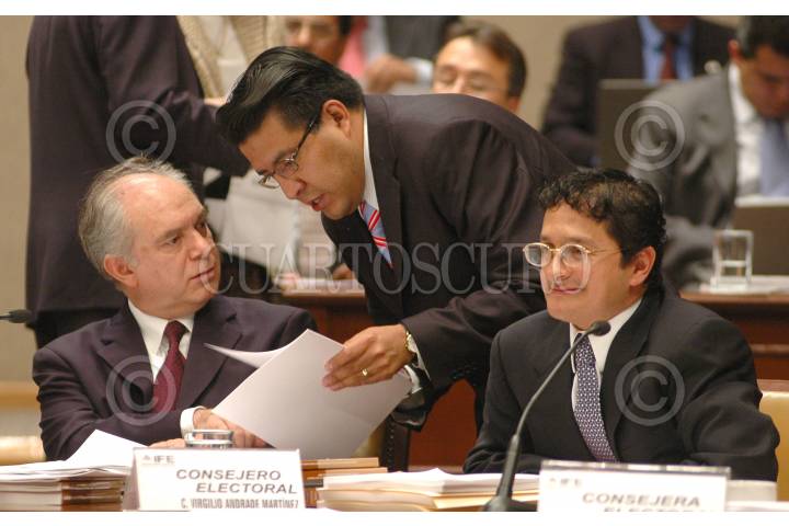 MÉXICO, D.F. 31MAYO2006.- Germán Martínez, representante del Partido Acción Nacional (PAN) ante el Instituto Federal Electoral (IFE) conversa con los consejeros Rodrigo Morales Manzanares y Marco Antonio Gómez Alcántar, durante la sesión ordinaria del IFE donde los consejeros resolvieron sancionar al PAN con 146 mil pesos por violar el artícvulo 25 del código electoral que obliga a los institutos políticos a rechazar apoyo de extranjeros en sus campañas. FOTO: Iván Stephens/CUARTOSCURO.COM