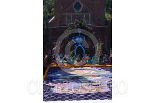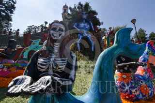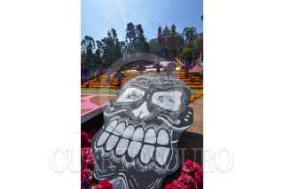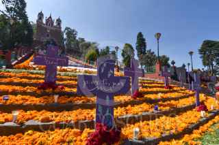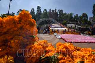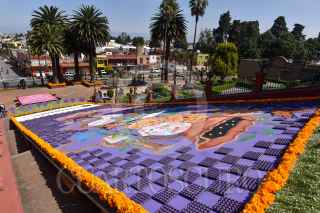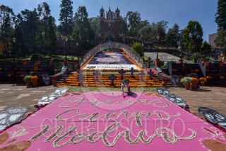 TOLUCA, ESTADO DE MÉXICO, 30OCTUBRE2020.- Las escalinatas del Calvario de Metepec lucen una ofrenda monumental dedicada a mujeres víctimas de violencia y fallecidos por CIVID-19, así como al personal medico, esta ofrenda fue elaborada en su mayoría por mujeres artistas y jóvenes; se puede observar un esqueleto grande con un árbol de la vida, a sus pies tlanchana a intervenidas por diferentes artistas, alebrijes gigantes, una catrina en la parte central de semillas, a los pies cruces que representan a las mujeres muertas por la violencia y el tapete de agradecimiento a los médicos; en esta ocasión sólo podrá ser vista a lo lejos ya que no se permitirá el acceso. FOTO: CRISANTA ESPINOSA AGUILAR /CUARTOSCURO.COM