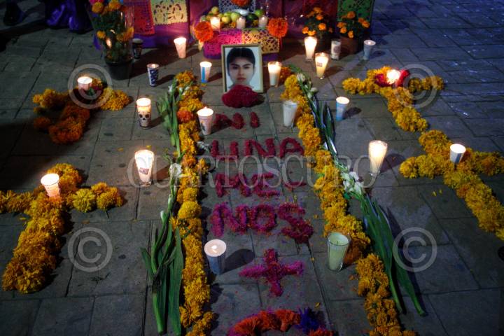 CHIMALHUACÁN, ESTADO DE MÉXICO, 30OCTUBRE2020.- Frente a la Procuraduria de Justicia de Chimalhuacán, Lidia Florencio madre de Diana víctima de feminicidio y colectivas feministas, realizaron una procesión y colocaron una mega ofrenda en memoria de todas las muertas del Estado de México. FOTO: ANDREA MURCIA /CUARTOSCURO.COM