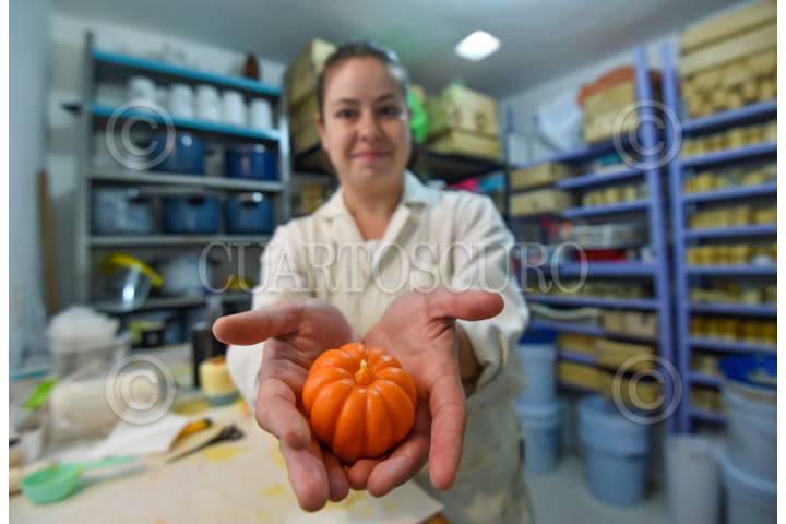 SAN ANTONIO LA ISLA, ESTADO DE MÉXICO, 31OCTUBRE2020.- Julia Villavicencio es una mujer emprendedora de San Antonio la Isla que se dedica a la elaboración de jabones y velas aromáticas, fundando hace 5 años su marca llamada “Mahwu”, para la época de Día de Muertos decidió elaborar velas con forma de calabaza de diversos tamaños con aroma a mandarina, canela y naranja; en su taller inicia fabricando sus moldes de silicon en base a calabazas reales, y posteriormente le da forma a la parafina, todo es un proceso artesanal y tuvo que innovar en sus productos ante la contingencia por COVID-19, ya que perdió pedidos y no pudo realizar ventas de forma física utilizando las redes sociales. FOTO: CRISANTA ESPINOSA AGUILAR /CUARTOSCURO.COM