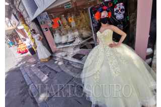 CIUDAD DE MÉXICO, 01NOVIEMBRE2020.- Afuera de las tiendas donde venden vestidos de novia y quince años, en la calle de Chile, hubo modelos mostrando varias piezas, quienes estaban maquilladas de catrinas, esto para atraer clientes ya que señalan que sus ventas están muy bajas. Uno de los pocos rubros que aún no han sido reactivados debido a la pandemia son los salones de fiestas, y esto los afecta directamente. FOTO: MOISÉS PABLO/CUARTOSCURO.COM