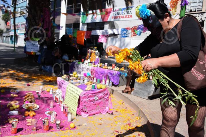 CIUDAD DE MÉXICO, 02NOVIEMBRE2020.- Sexoservidoras colocaron una ofrenda de Día de Muertos en honor a las trabajadoras sexual es que han muerto, la ofrenda fue colocada sobre la avenida, Puente de Alvarado, esquina con Buenavista, las sexoservidoras fueron colocando flores, adornos y los nombres de sus compañeras a quienes ofrenda en estos días. FOTO: DANIEL AUGUSTO /CUARTOSCURO.COM