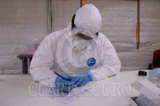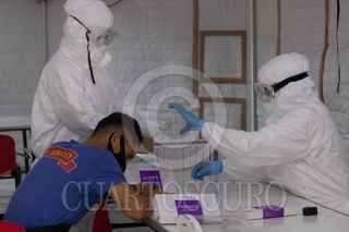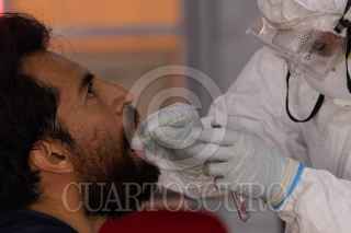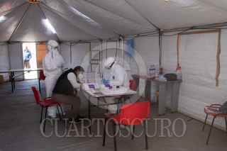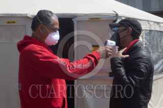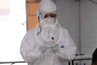 CIUDAD DE MÉXICO, 05NOVIEMBRE2020.- Personal médico de la Cruz Roja realiza pruebas PCR de orofaringe para detectar Covid-19 en locatarios y transeúntes de la Central de Abastos. La Doctora Lizbeth Rodríguez y el enfermero Jorge Guadalupe realizan de 25 a 50 pruebas diarias; el resultado tarda 24 horas después de la realización de la prueba y se da a conocer por correo electrónico y mensaje texto. El Hospital de Campo se encuentra instalado en el estacionamiento 3 nororiente del Sector Abarrotes y Víveres de la CEDA y estará instalado 3 semanas aproximadamente. FOTO: GRACIELA LÓPEZ /CUARTOSCURO.COM