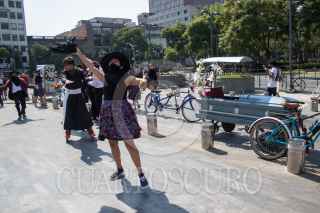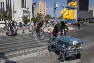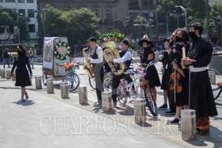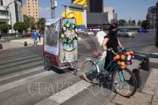 CIUDAD DE MÉXICO, 08NOVIEMBRE2020.- La compañía Teatro Entre 2 estrenó "Funeral sobre ruedas", una intervención escénica en movimiento inspirada en la tradición mexicana del Día de Muerto. Los actores deambularon en bicicleta tocando instrumentos a modo de cortejo fúnebre, al frente de ellos iba una caja mortuoria. El elenco lo conforman Francia Castañeda, Arnaud Charpentier Olivier Dautais, Alexandre Doyhamboure, Xóchitl Galindres, Juan Sergio García, Marco Guagnelli, Paola Herrera, Meraqui Pradis y Jerónimo Zoe Serna, de quien es la composición y dirección musical. FOTO: MOISÉS PABLO/CUARTOSCURO.COM