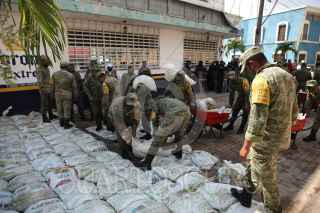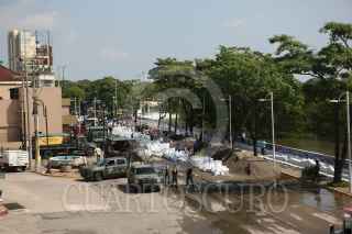 VILLAHERMOSA, TABASCO, 09NOVIEMBRE2020.- Soldados de la Secretaría de la Defensa Nacional están montando un dique con costales de arena en la zona del Malecón Carlos A. Madrazo, a la altura de la colonia 27 de Febrero, en donde hay filtraciones de agua por la creciente del Río Grijalva. El coronel general José Fausto Torres Sánchez de la 30 Zona Militar coordinó las acciones que se realiza con el apoyo de la Policía Estatal para resguardo y evitar rapiña de costales. FOTO: CARLOS CANABAL OBRADOR/CUARTOSCURO. COM