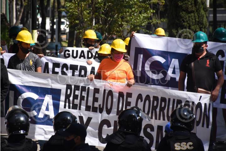 CIUDAD DE MÉXICO, 09NOVIEMBRE2020.- Trabajadores de empresas subcontratadas por ICA protestaron afuera de las instalaciones de la empresa y se disponían a marchar rumbo al aeropuerto de la ciudad pero elementos de la policía capitalina impidieron su paso encapsulados a la altura de Av. De Los Insurgentes. Los trabajadores exigen el pago de sus salarios. FOTO: DANIEL AUGUSTO /CUARTOSCURO.COM