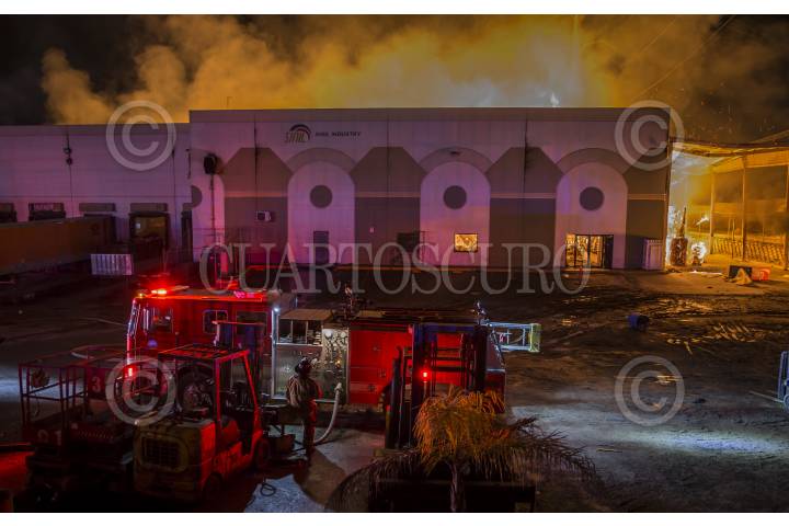 TIJUANA, BAJA CALIFORNIA, 09NOVIEMBRE2020.- Fuerte incendio consumió parte de la fábrica de corrugados Sinil ubicada en el Parque Industrial Pacífico. El hecho ocurrió alrededor de las 4:00 hrs del este lunes y obligó al cierre de las vialidades. Al lugar acudieron socorristas de las Cruz Roja, elementos de Protección Civíl y alrededor de 40 elemenos del cuerpo de Bomberos para extinguir el fuego. La planta está ubicada en avenida Los Cabos, a un costado de una subestación de la Comisión Federal de Electricidad (CFE), en medio de maquiladoras y frente a una guardería. No se reportaron heridos. FOTO: OMAR MARTÍNEZ /CUARTOSCURO.COM