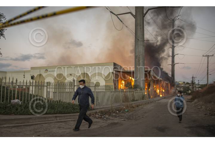 TIJUANA, BAJA CALIFORNIA, 09NOVIEMBRE2020.- Fuerte incendio consumió parte de la fábrica de corrugados Sinil ubicada en el Parque Industrial Pacífico. El hecho ocurrió alrededor de las 4:00 hrs del este lunes y obligó al cierre de las vialidades. Al lugar acudieron socorristas de las Cruz Roja, elementos de Protección Civíl y alrededor de 40 elemenos del cuerpo de Bomberos para extinguir el fuego. La planta está ubicada en avenida Los Cabos, a un costado de una subestación de la Comisión Federal de Electricidad (CFE), en medio de maquiladoras y frente a una guardería. No se reportaron heridos. FOTO: OMAR MARTÍNEZ /CUARTOSCURO.COM